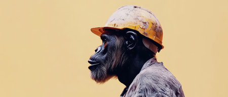A gorilla dressed in work attire and a helmet stands on a construction site focused on its task amidst a bright background.
