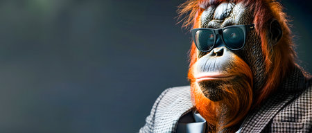A stylishly dressed orangutan wearing a suit and sunglasses presenting a witty and intelligent business professional persona in a creative and conceptual portrait