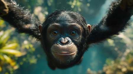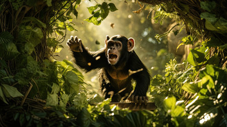 A young chimpanzee swings gracefully through the lush foliage of a vibrant tropical forest. Sunlight filters through the trees, highlighting the playful atmosphere of the jungle.