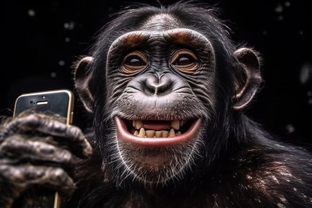 Chimpanzee monkey ape wild animal making a selfie with smartphone illustration generative ai