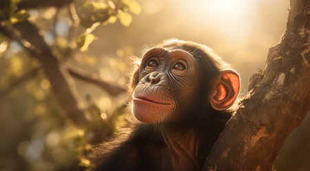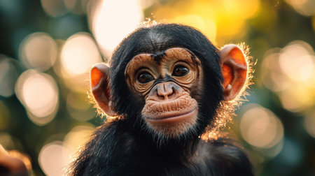Close-up of a young chimpanzee with a soft-focus bokeh background, highlighting its facial features and expression, symbolizing wildlife and nature.