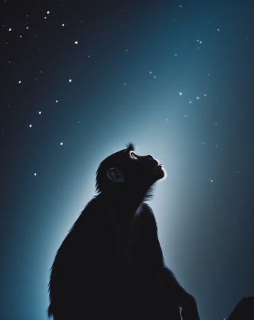 AI Generated. Silhouetted Primate Gazing Upwards In Darkness