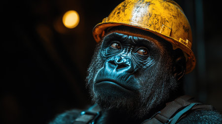A strong gorilla dons a yellow hard hat while in a dark construction site, suggesting an unexpected blend of nature and industry. The gorilla's expression conveys intelligence and curiosity about its surroundings.