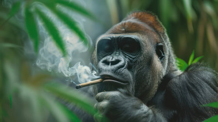 Gorilla smoking a cigar in the jungle. Selective focus.