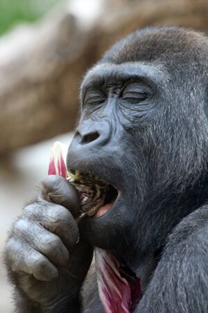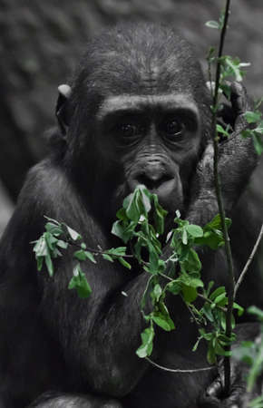 A gorilla female young girl eats green shoots of a plant, the contrast between black wool and green leaves., Vegetarian.