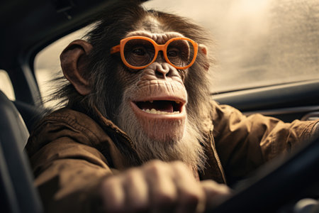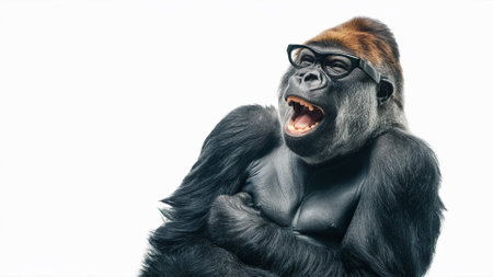A cheerful humanoid gorilla. Clever laughing monkey in glasses. AI generated.