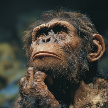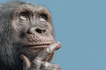 A chimpanzee gazes thoughtfully into the distance, its expressive face and deep eyes reflecting a moment of contemplation.