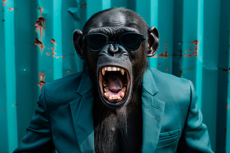 Portrait of a screaming gorilla in a suit and sunglasses on a green background