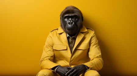 a gorilla wearing a yellow jacket stands against a vibrant yellow wall, creating a striking contrast. this bold fashion photography style captures the hyperrealistic details of the gorilla's costume. the darktable processing enhances the surrealism of the image, while the muted tones add a touch of elegance. shot with a fujifilm x-t4, this portrait showcases the gorilla's handsome features. ai generated