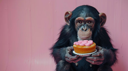 Chimpanzee joyfully presents a delightful cake in a charming setting.