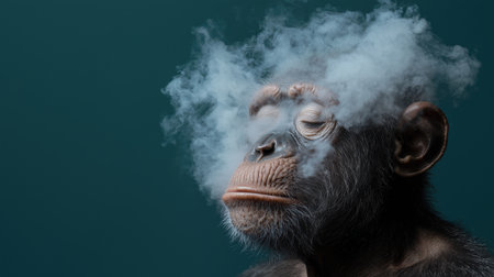 A chimpanzee gazes upwards, lost in thought amidst the ethereal mist of its natural forest habitat.