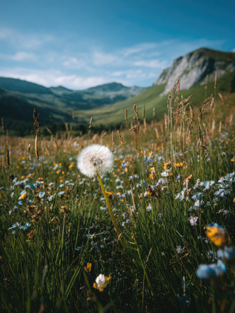 A close-up view presents a dandelion puffball amidst a field of wildflowers. The scene is bathed in natural sunlight, highlighting the textures of grass and blossoms. Mountains rise in the distance under a blue sky, suggesting an outdoor environment suitable for nature-related visual projects.