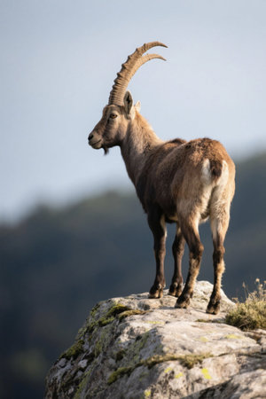 An enchanting mountain goat stands on a rock formation, showcasing its powerful presence in a tranquil, rugged landscape. Perfect for nature lovers.