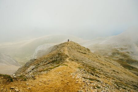 A route through mountain peaks and hills through majestic landscapes with tourists and travelers in the distance. Active tourists, hiking, Caucasus Mountains Oshten Fisht. Sport lifestyle concept