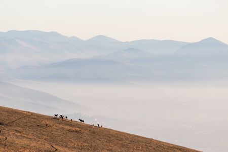 Some horses silhouettes on top of Subasio mountain, over a sea of fog filling the Umbria valley