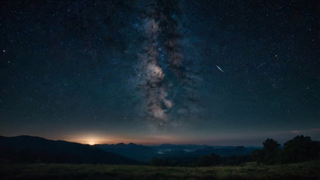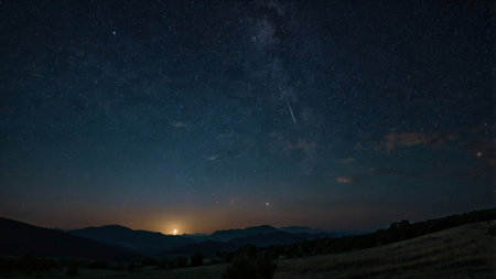 A stunning view of a vibrant sunset sky features a shooting star streaking across the twilight horizon. This captivating mountain landscape showcases the beauty of nature as stars twinkle above, creating a peaceful and serene atmosphere perfect for inspiring adventure and relaxation.