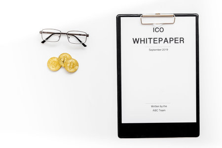 Crypto currency. White paper ICO, coins, glasses on white background top view