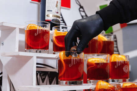 The waiter serves cocktails on a tray. Close-up orange and red cocktails with orange and mint at the restaurant