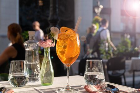 Glass of Aperol Spritz cocktail on the table in street restaurant, famous refreshing drink in sunny day