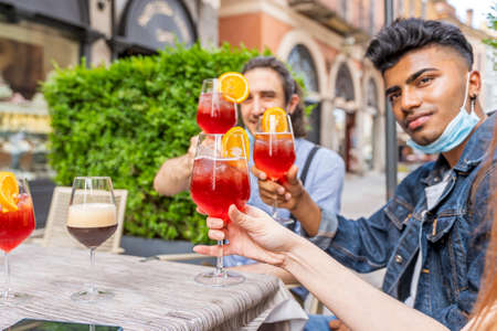 Friends drinking colored cocktail at outdoor bar with face masks - New normal lifestyles concept with happy people toasting drinks outside