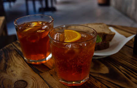 Italian cocktail with orange slices on gray stone table. Summer drink, homemade.