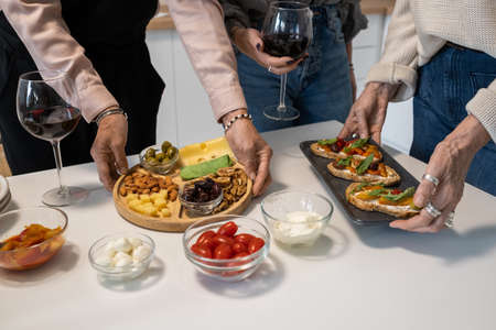 Close-up of mature women serving appetizers and sandwiches on the table preparing for dinner party