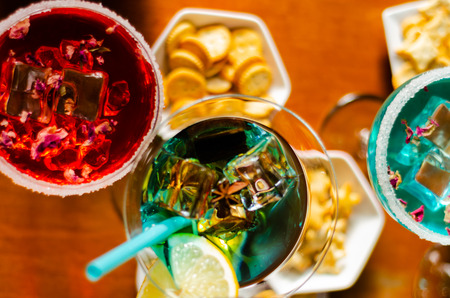 Tasty and colorful drinks based on various alcohols, syrups and liqueurs, unique effect of the bartender's work, party night