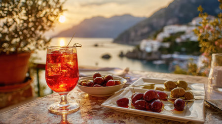 Refreshing red cocktail with olives overlooking a stunning Mediterranean sunset.