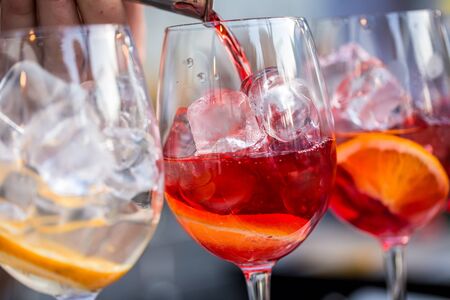 Glasses of cocktails on the bar. bartender pours a glass of sparkling wine with Aperol.