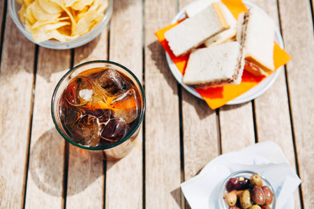Cola drink with lemon and snack
