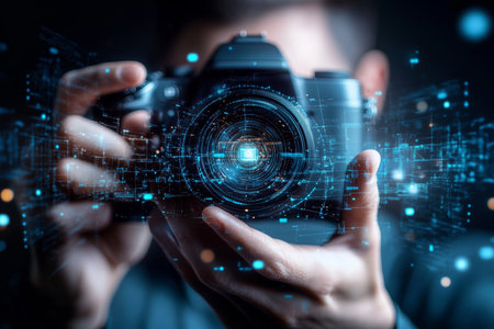A detailed macro shot captures the intricate mechanics of a professional camera lens. Cool blue light reflects off the glass surfaces, highlighting the precision engineering within, while a warm flare suggests a moment of creative capture. This image symbolizes technology, vision, and the art of seeing the world through a new perspective.