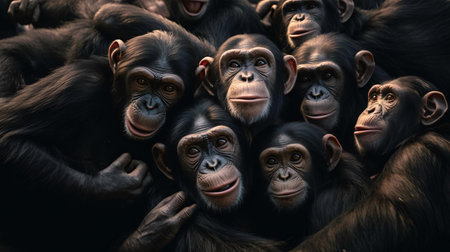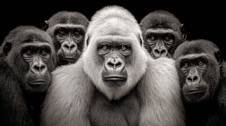 Five gorillas are the subjects of a studio portrait, rendered in monochromatic tones. The central gorilla is distinguished by its silvery fur, surrounded by four darker counterparts. The composition highlights contrasting textures and expressions, set against a dark backdrop. The image could be used for various editorial and illustrative purposes.