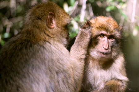 Wild monkey as Barbary Macaque sitting and grooming other monkey.