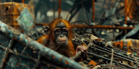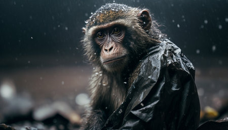 A monkey standing among the piles of plastic waste and the rain,Concept of saving the world. Generative AI.