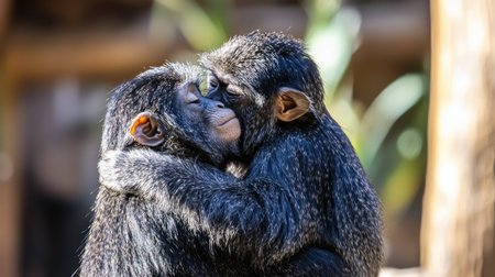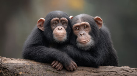 Two charming chimpanzees sit closely together on a branch, showcasing their strong bond and affection in a serene natural setting filled with soft light.