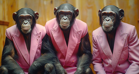 Group of monkeys in pink suits sitting in a row on wooden background