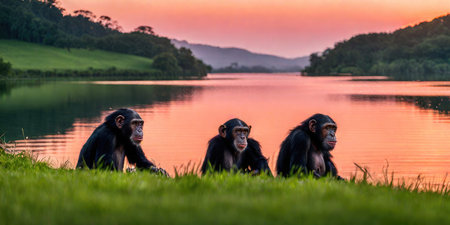 Chimpanzee family sitting on the bank of a lake at sunset