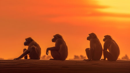 Silhouette of a group of monkeys sitting on a log at sunset