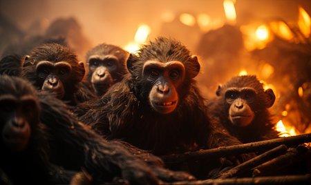 Primate portrait: Endangered bonobo staring, strong macaque in background generated by artificial intelligence