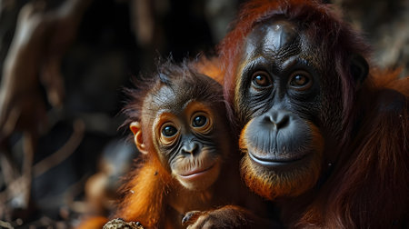 An AI-generated illustration of an orangutan mother cradling her baby in her arms