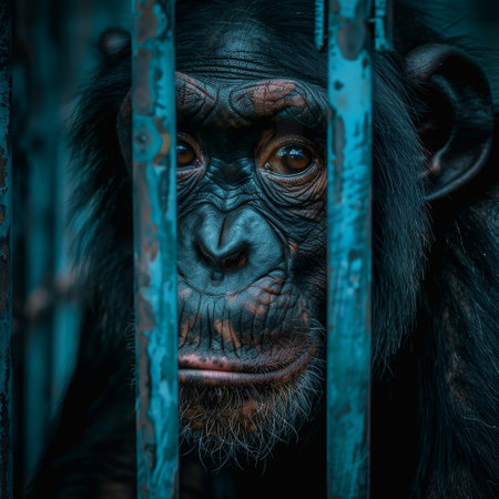 Chimpanzee behind bars with a thoughtful expression