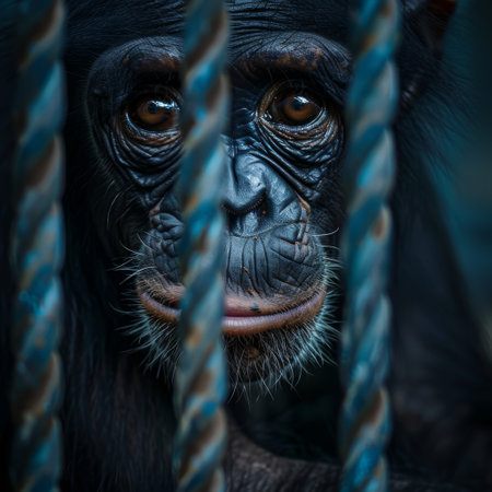 Close-up of a chimpanzee behind bars with a thoughtful expression