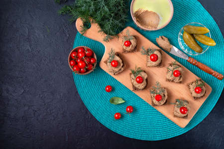 Canapes with rye bread, liver pate, cherry tomatoes. Breakfast snack. Top view. Copy space