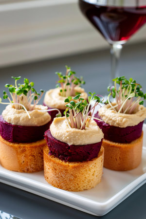 Appetizers featuring beetroot hummus and microgreens on bread, pairing with a glass of red wine