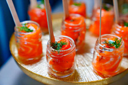 small glass jars with red salted fish. catering services for the party.