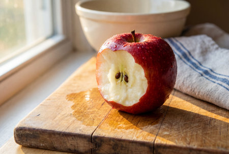 A fresh bitten red apple featuring water drops and exposed seeds rests on a vintage wooden surface bathed in warm natural sunlight near a kitchen window.