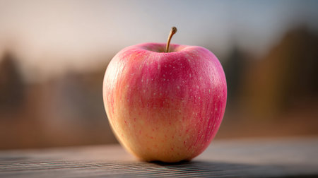 Fresh Red Apple Displayed on Rustic Wooden Surface with Blurry Background