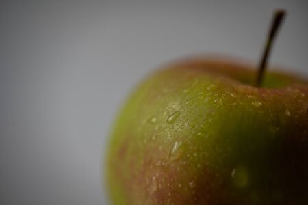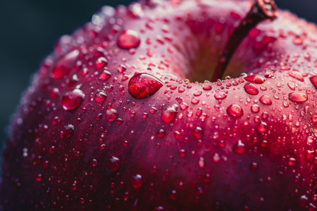 A super close up of a delicious apple with some water drops over it over a dark background with copy space
