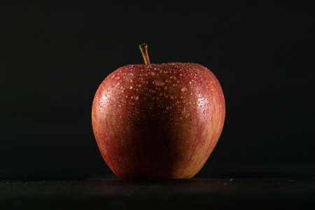 One fresh Gala apple on a black background with copy space with water drops