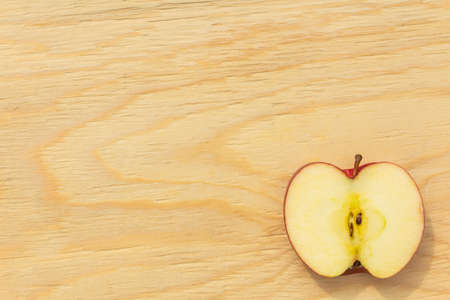 Fresh tasty apple slice on natural wooden background, good for vegan food, alphabet and your advertisement, vitamins for immune system